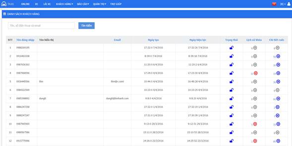 Xem thông tin chi tiết khách hàng theo thời gian, số khách hàng sử dụng để đặt cuốc taxi là tiền đề cho sự phát triển của công ty. Ngoài ra, người quản trị có thể mở khóa hoặc khóa tài khoản khách hàng, xem chi tiết lịch sử cuốc đã đặt.